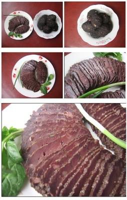 红豆腐,是传统食品,尤以燕子河一带的为佳。据说,它是当地山民年夜饭的必备菜,取红豆的谐音“都富”。其制作方法是以新鲜猪血、碎猪肉、豆腐等为主要原料,配上姜末、蒜花、食盐,拌匀后灌入洗净的猪膀胱或猪大肠中,或做成馒头状,日晒数日,挂在厨房内烟熏月余即可。食用时,切成片状,蒸煮、炒菜均可。其色如枣,鲜嫩油润,风味独特。